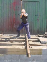 fæstne planker på murens overkant. Plankerne skal danne kant for en senere